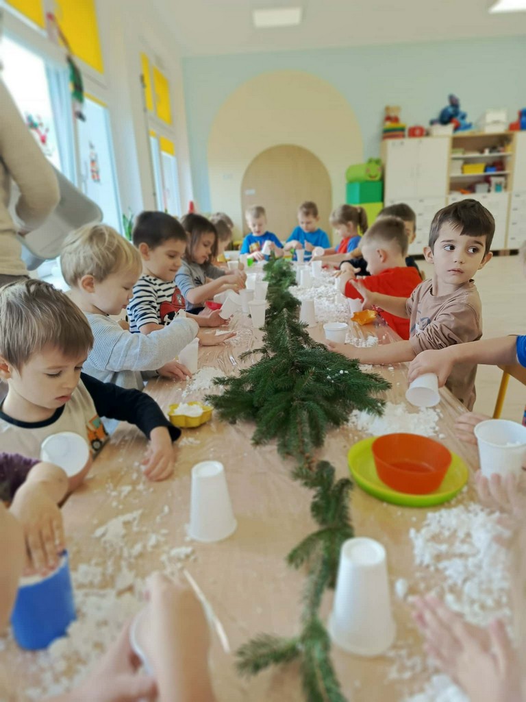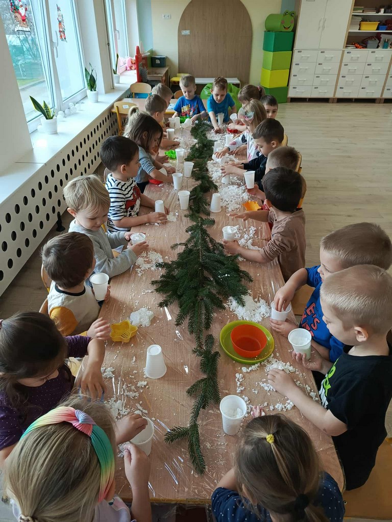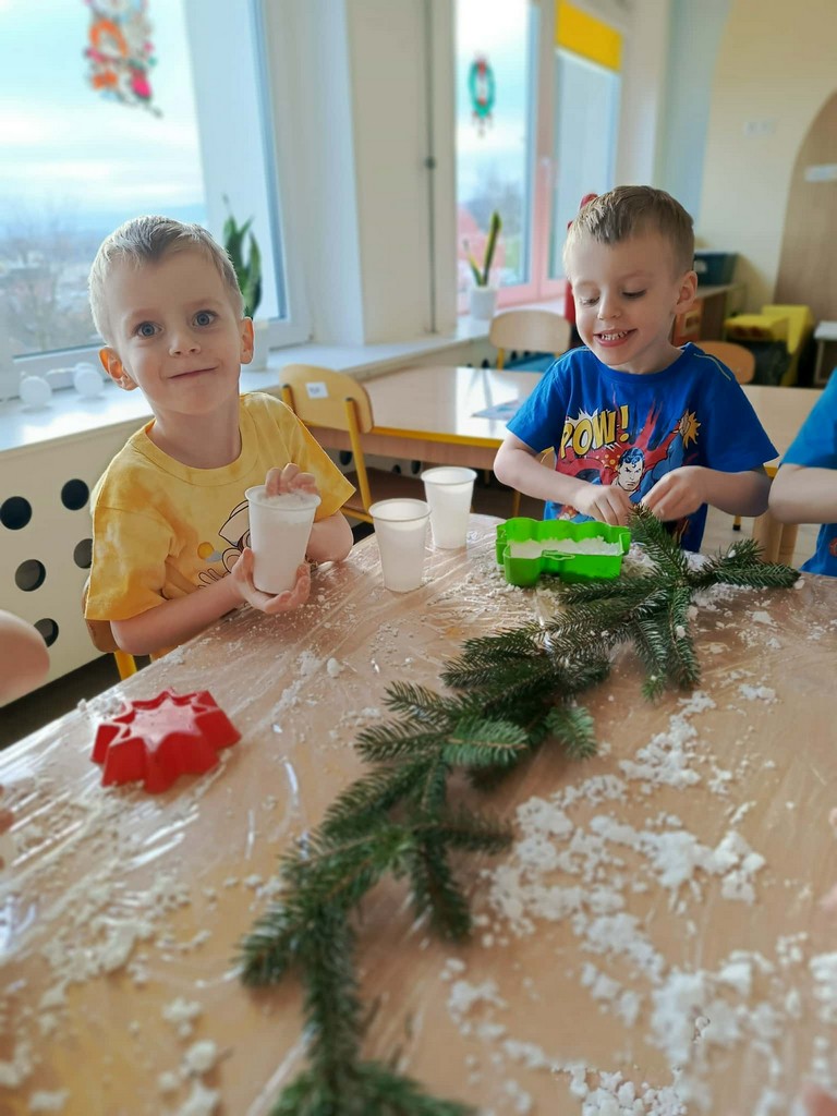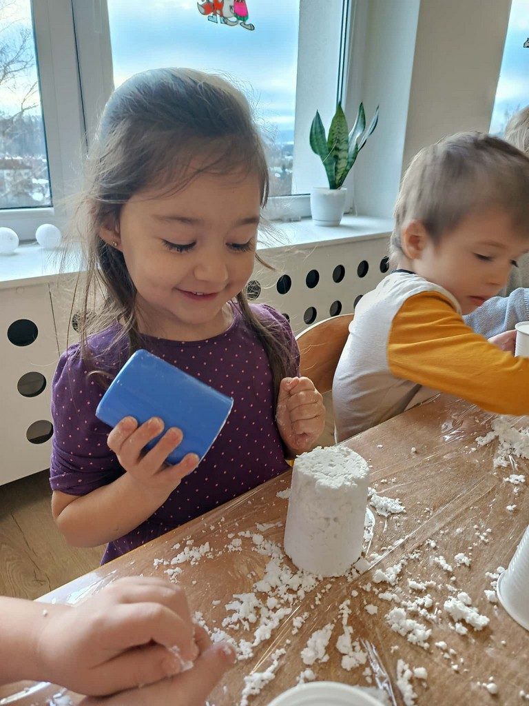 W naszym przedszkolu czas przedświąteczny jest obfity w ciekawe aktywności. Śnieg za oknami niestety stopniał, więc postanowiliśmy aby na dłużej i nas zagościł. Gdzie? W sali przedszkolnej! Zapytacie ,ale jak to? Śnieg w sali? Oczywiście! Sami zobaczcie jak średniaki lepiły mini bałwany, pociągi, gwiazdki ze sztucznego śniegu podczas zajęć sensorycznych. Cudnej zabawie towarzyszyła mikołajkowa muzyka, która dodatkowo umilała czas.