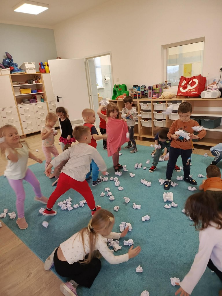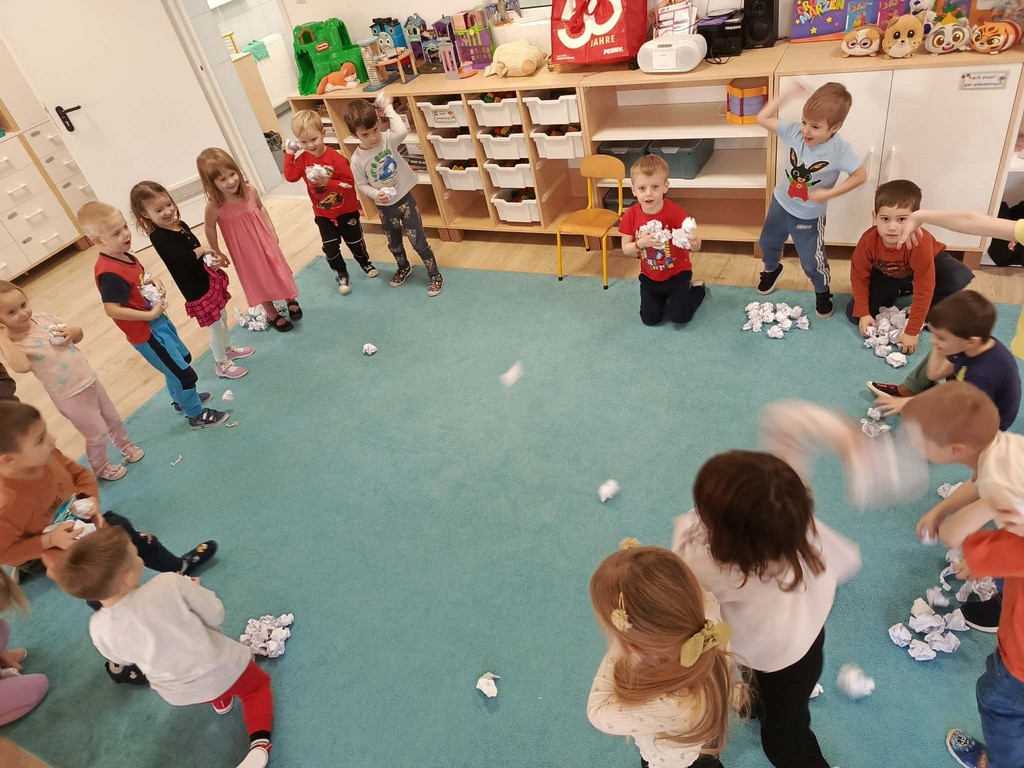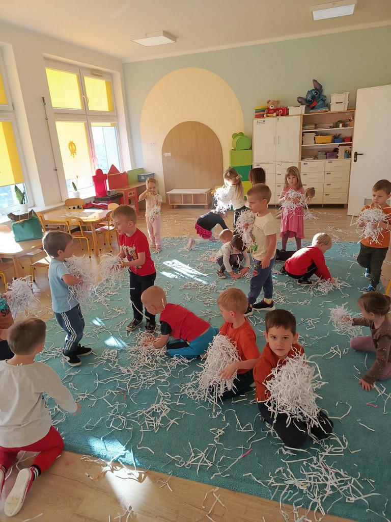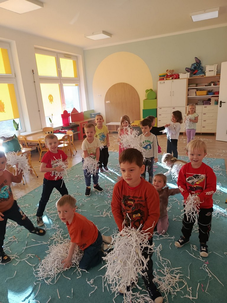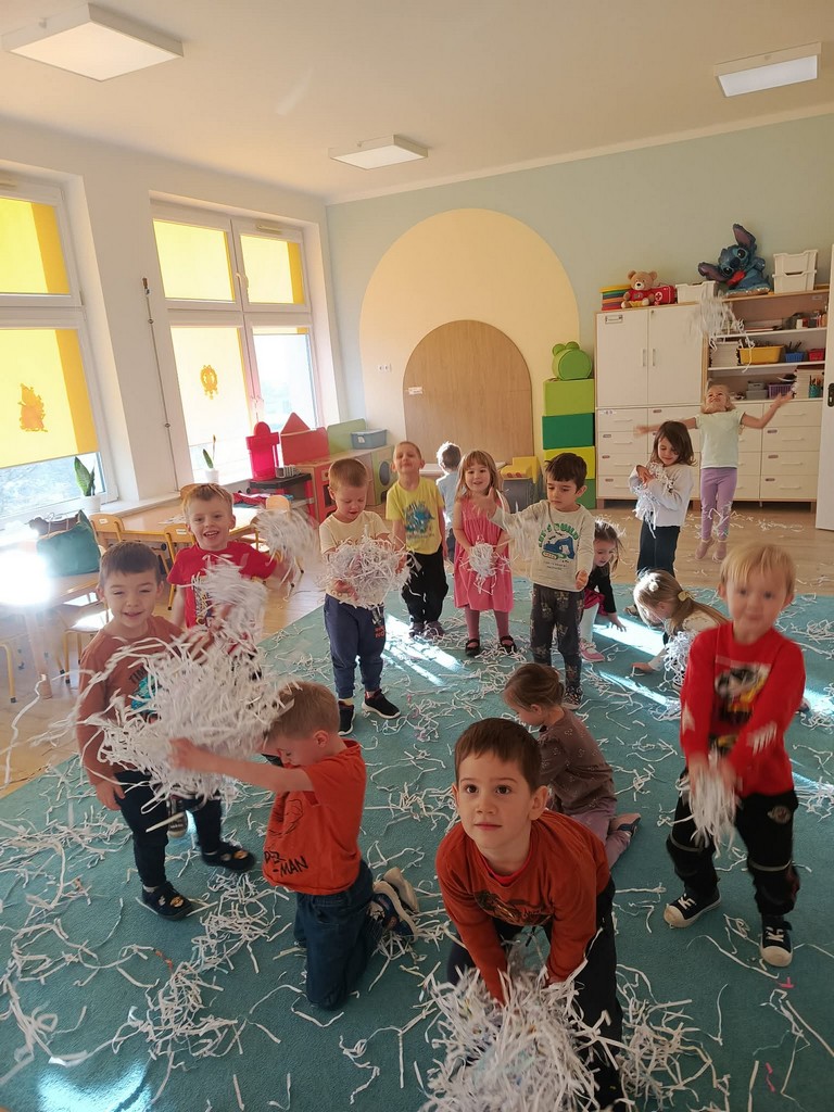 Czy samymi książkami żyją nasze przedszkolaki? Oj nie! Mamy też czas na zabawę i to świetną zabawę! Radość, radość i jeszcze raz ogromną radość panowała podczas bitwy śnieżnej w sali. Spójrzcie sami, te uśmiechy mówią same za siebie.