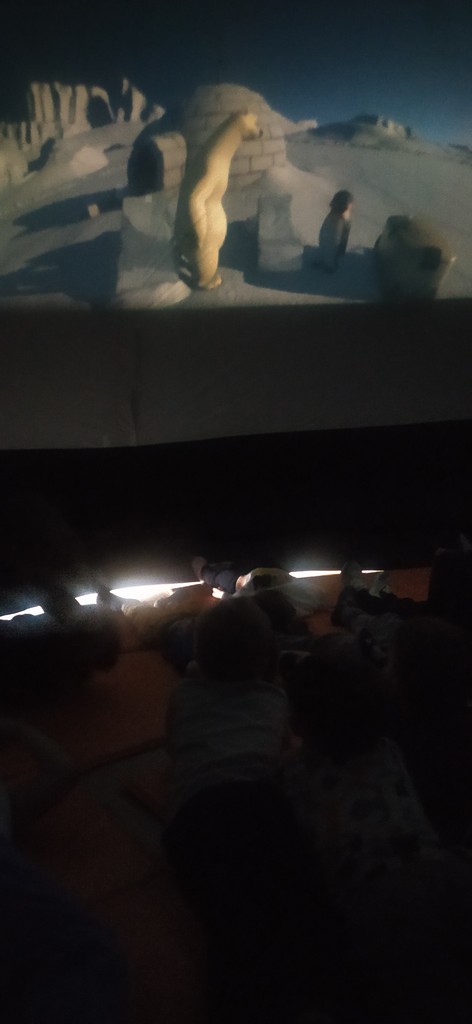 W piątek 6 marca przedszkolaki wzięły udział w seansie filmowym kina sferycznego. Obejrzeliśmy film pt. "Tajemnica nocy polarnej”- przedstawiający przygody pingwina Jamesa i misia Vladimira, którzy badają przyczyny długich nocy na biegunach. Na półkolistym ekranie, który nas otaczał mieliśmy okazję zobaczyć jak bohaterowie budują obserwatorium i statek kosmiczny, aby zrozumieć zjawiska astronomiczne.