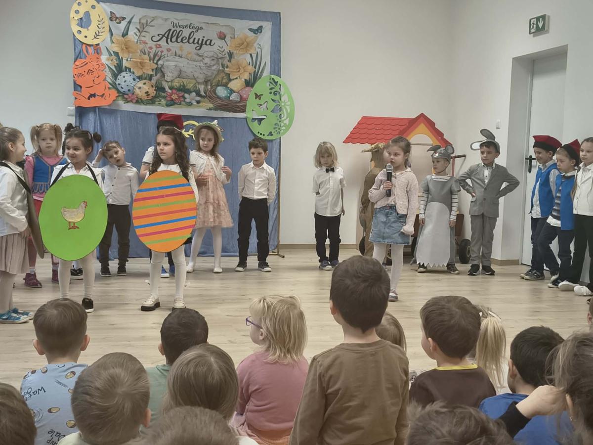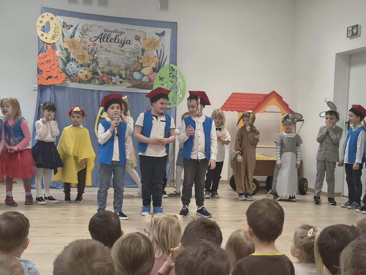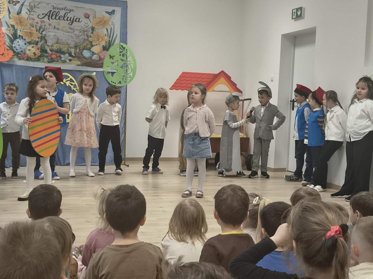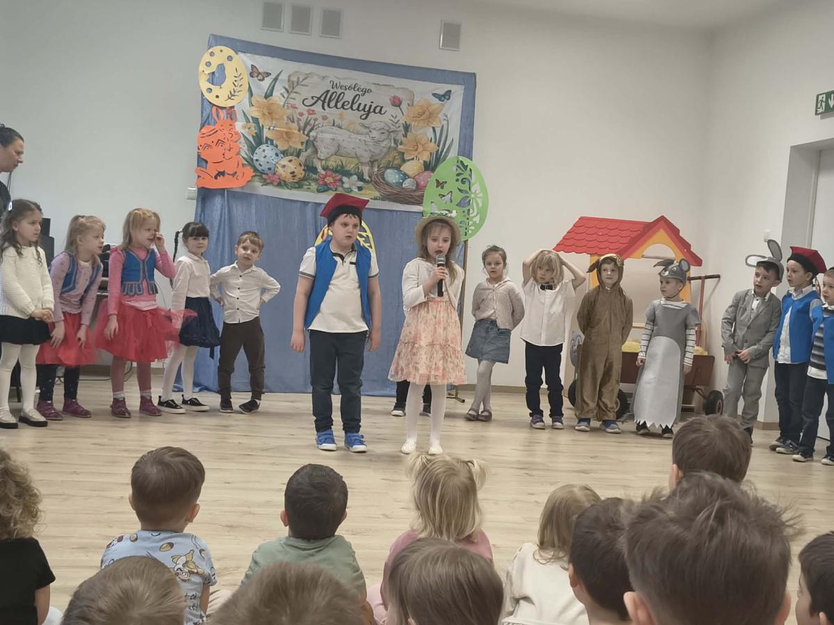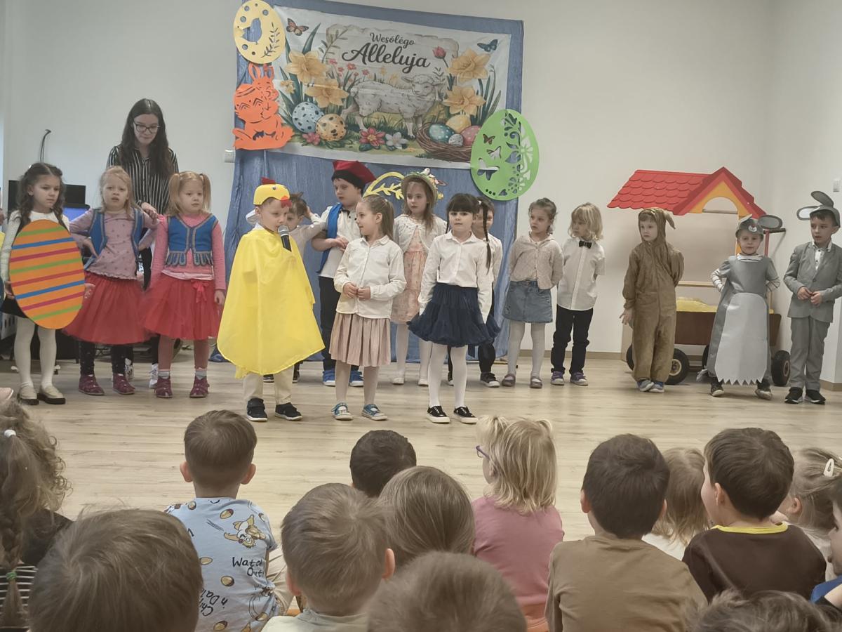 31 marca w naszym przedszkolu odbył się uroczysty występ wielkanocny przygotowany przez dzieci z grupy II. Przedszkolaki z wielkim zaangażowaniem zaprezentowały przygotowany program artystyczny, w którym nie zabrakło wierszyków, piosenek oraz elementów inscenizacji nawiązujących do tradycji Świąt Wielkanocnych. Mali artyści wystąpili w pięknych, kolorowych strojach, wcielając się m.in. w zajączki, kurczątka oraz pisanki. Występ był również okazją do przybliżenia przedszkolakom polskich tradycji wielkanocnych.