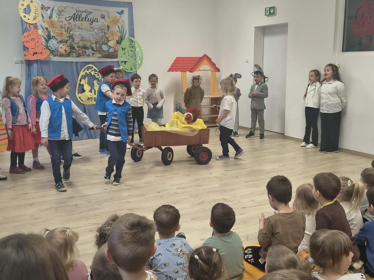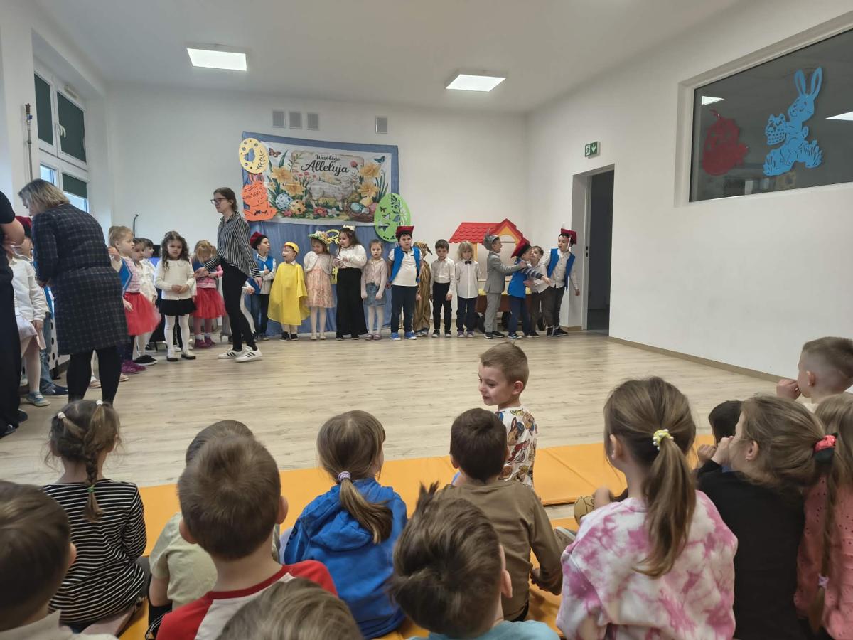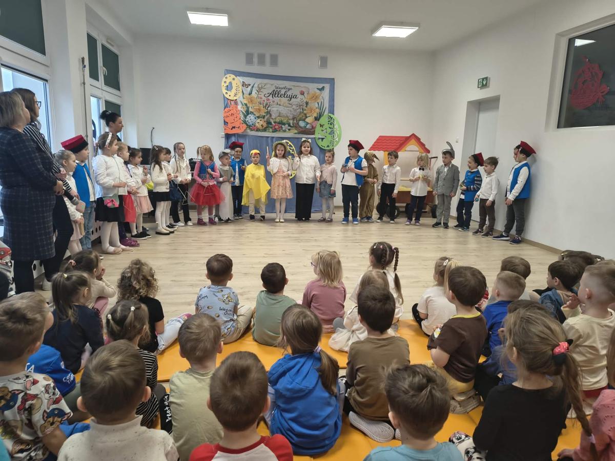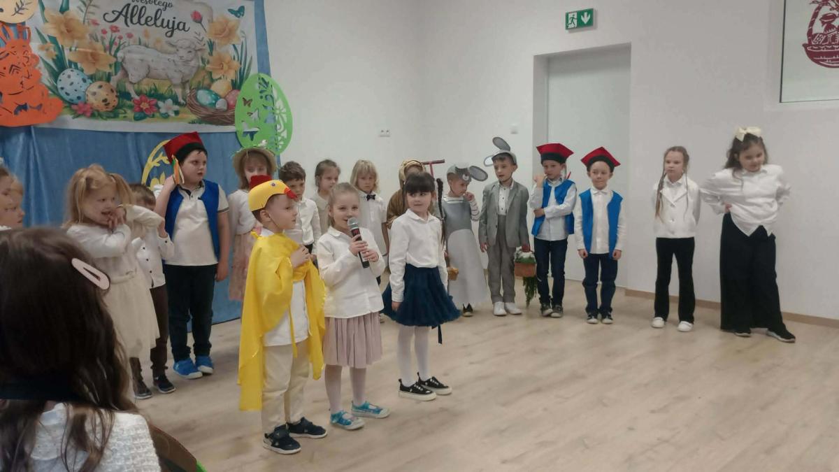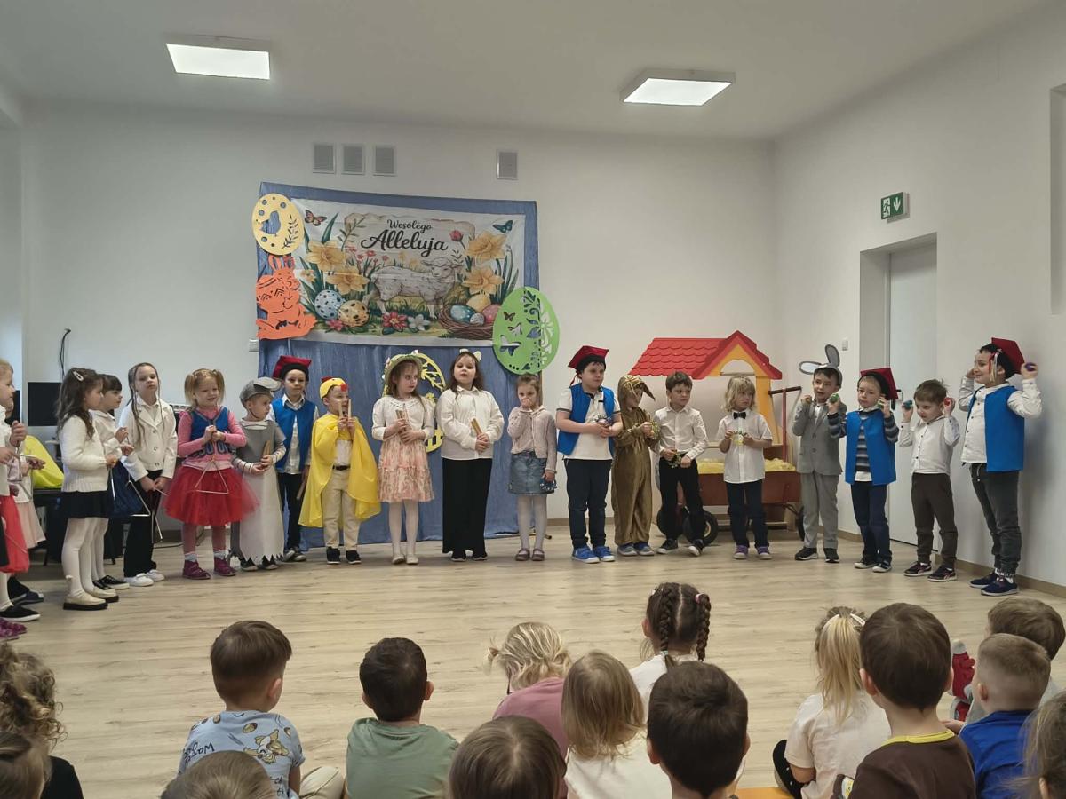 31 marca w naszym przedszkolu odbył się uroczysty występ wielkanocny przygotowany przez dzieci z grupy II. Przedszkolaki z wielkim zaangażowaniem zaprezentowały przygotowany program artystyczny, w którym nie zabrakło wierszyków, piosenek oraz elementów inscenizacji nawiązujących do tradycji Świąt Wielkanocnych. Mali artyści wystąpili w pięknych, kolorowych strojach, wcielając się m.in. w zajączki, kurczątka oraz pisanki. Występ był również okazją do przybliżenia przedszkolakom polskich tradycji wielkanocnych.